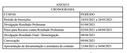 O candidato terá prazo entre os dias 2 de abril de 2021 a 4 de abril de 2021, após resultado preliminar no dia 1 de abril de 2021, para interpor recurso em caso de desconformidade com sua pontuação.