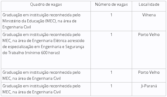 edital, são ofertadas quatro vagas para pessoas formadas em Engenharia Civil e Engenharia Elétrica, que serão lotados na capital Porto Velho e nos municípios de Vilhena e Ji-Paraná, e a remuneração chega a mais de R$ 5.500.