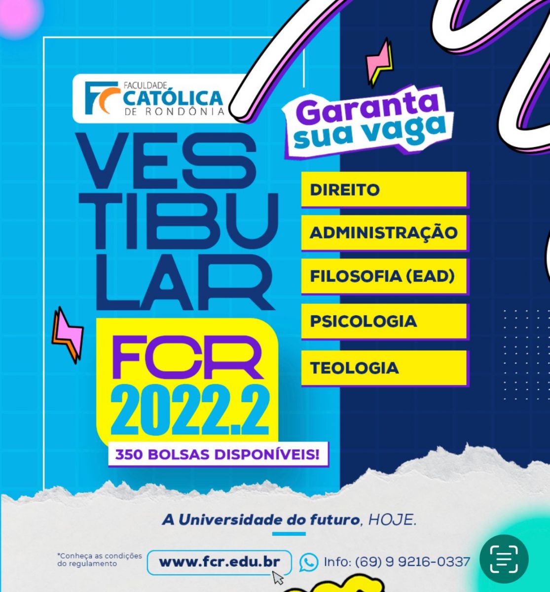 Conquistar a graduação ou um curso superior visando a formação profissional é facilitada, mais uma vez, pela Faculdade Católica de Rondônia (FCR). A instituição abre o Processo Seletivo (Vestibular 2022.2) nas modalidades de: Vestibular, Transferência Externa, Portadores de Título/Diploma (2ª graduação) e Nota do Exame Nacional do Ensino Médio (Enem), obtidas entre os anos de 2015 a 2021.(INSCREVA-SE AQUI)