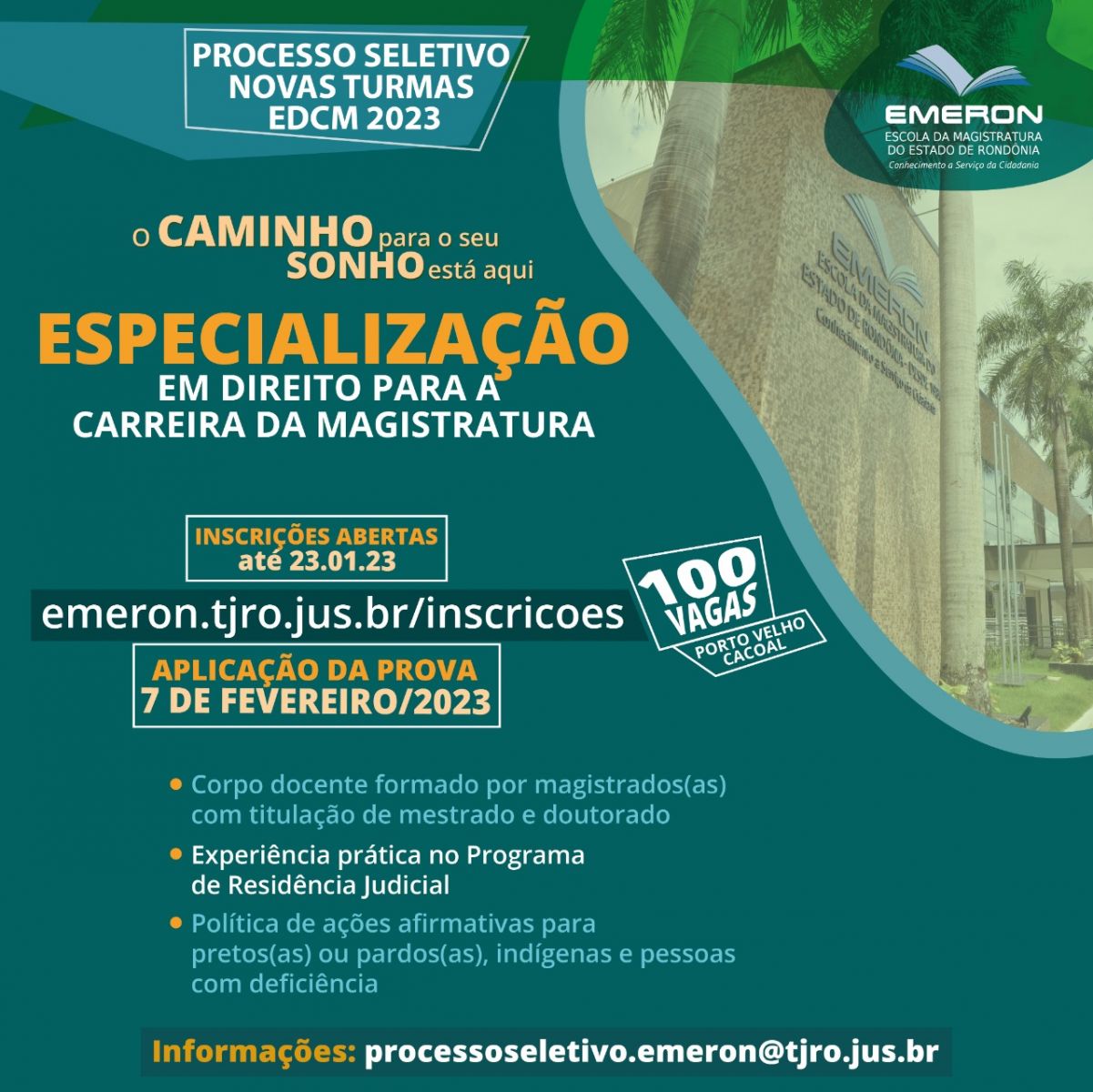 As inscrições para a Especialização em Direito para a Carreira da Magistratura (EDCM) – Turma 2023/2024 seguem abertas até o próximo dia 23 de janeiro, no site da Escola da Magistratura do Estado de Rondônia – Emeron (emeron.tjro.jus.br/inscricoes). Ao todo são ofertadas 100 vagas divididas entre a sede da Emeron, em Porto Velho, e o Núcleo Pedagógico da Escola em Cacoal.