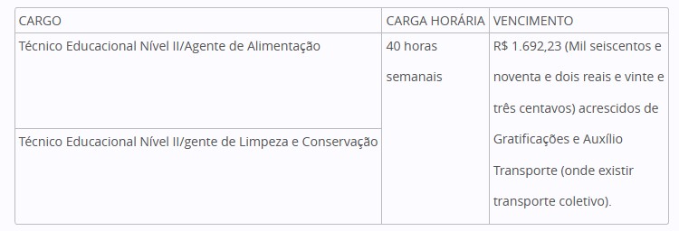 “O Técnico Educacional Nível I (agente de alimentação) desenvolverá atividades que envolvem a execução de serviços de alimentação escolar da Seduc. Já o Técnico Educacional Nível II (agente de limpeza e conservação) fará atividades que envolvem a execução de serviços de limpeza e conservação das instalações das unidades escolares e administrativas”, explicou a secretária da pasta, Ana Pacini.