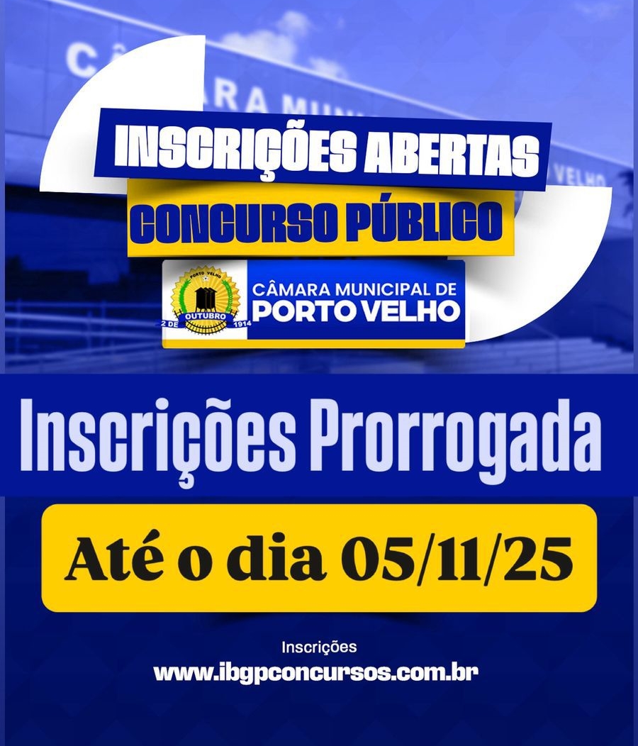 A Câmara Municipal de Porto Velho informa que o prazo de inscrições do concurso público foi prorrogado até o dia 5 de novembro.