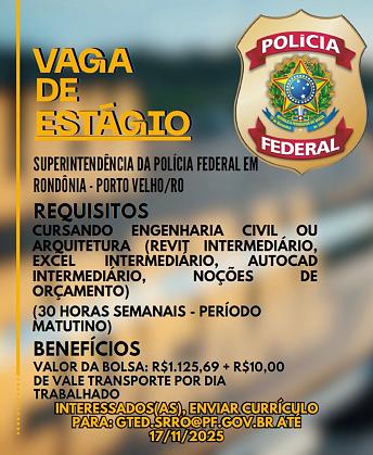 A Polícia Federal em Rondônia anunciou a abertura de uma vaga de estágio para estudantes de Engenharia Civil ou Arquitetura. A oportunidade é destinada à Superintendência da PF em Porto Velho e busca acadêmicos devidamente matriculados no ensino superior.
