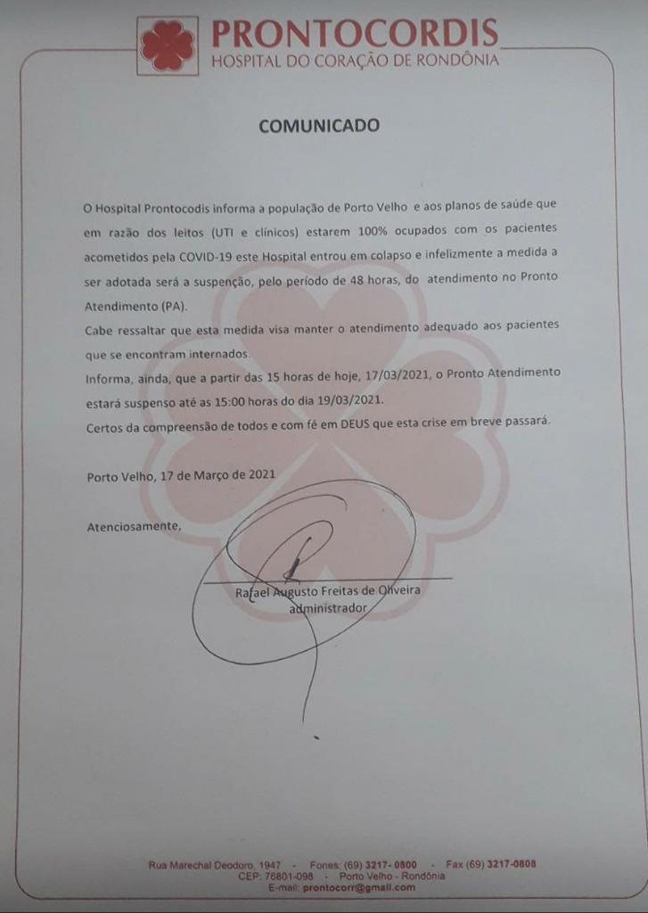 A direção do Hospital Prontocordis em Porto Velho anunciou através de comunicado oficial que suspendeu seu serviço de pronto atendimento após entrar em colapso por não suportar a demanda dos pacientes de COVID-19 internados na unidade hospitalar.