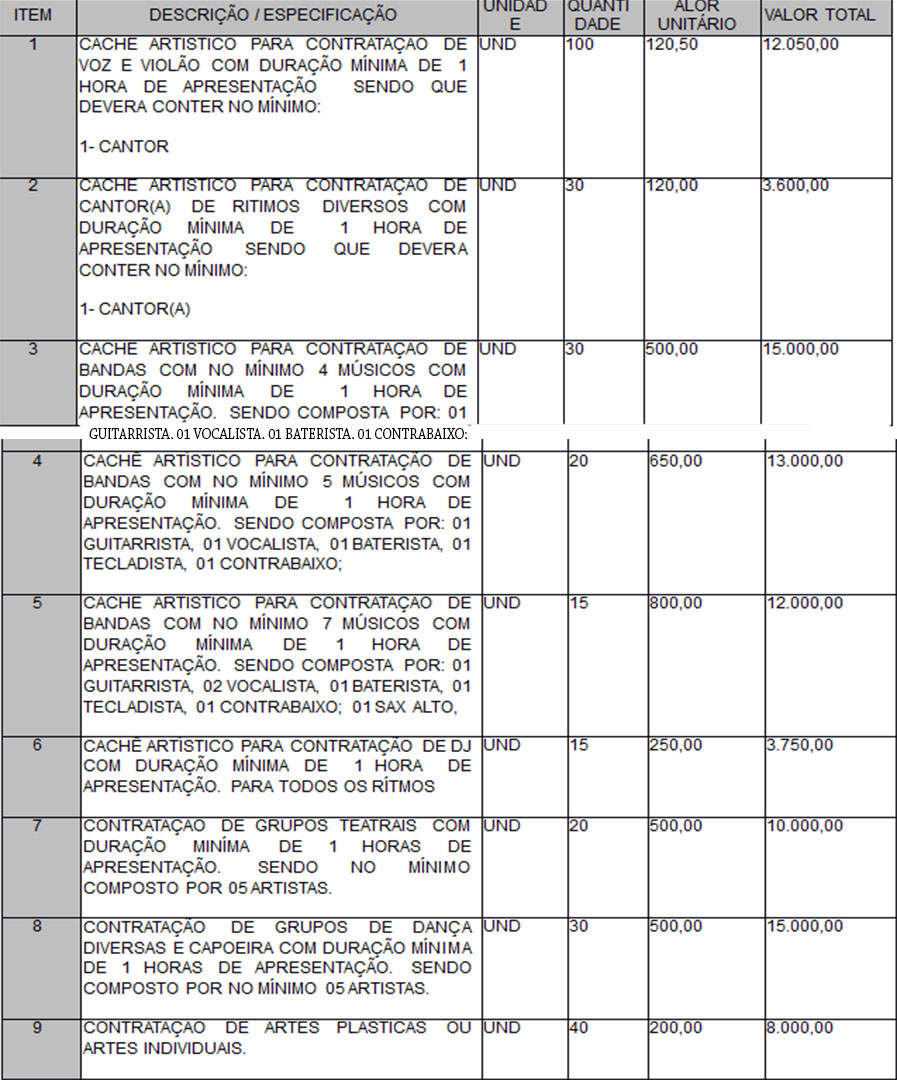 Os cachês foram estipulados com base na tabela estabelecida pela Ordem dos Músicos do Brasil (OMB). Os valores são referente a apresentações de uma hora, estabelecido por meio de contrato de prestação de serviço.