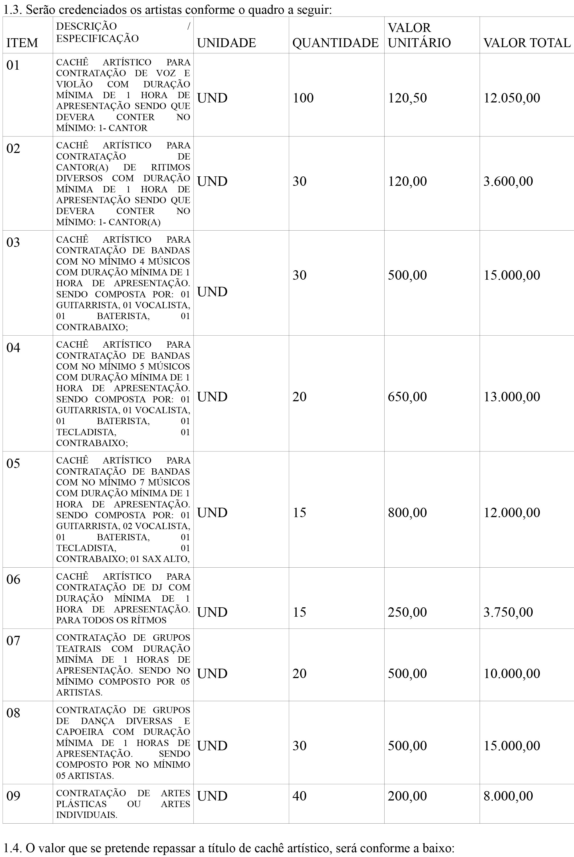 O credenciamento é aberto as pessoas físicas ou jurídicas que atuem com os gêneros voz e violão, axé, forró, rock, samba, e grupos teatrais, grupos de danças diversificados, grupos de capoeira, artes plásticas e artes individuais.