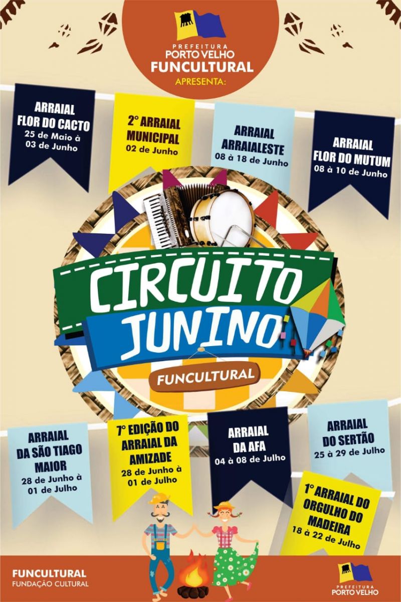 O Circuito Junino, promovido pela Prefeitura de Porto Velho, por intermédio da Fundação de Cultura, inicia nesta sexta-feira,25, com o Arraial Flor do Cacto, na zona Sul da capital, e encerra no dia 29 de julho, com o Arraial do Orgulho do Madeira, na zona Leste.