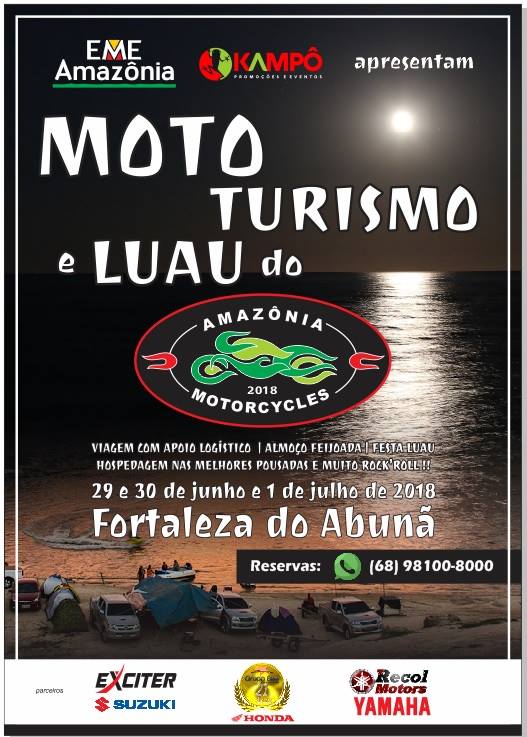 O Moto Turismo e Luau será realizado nos dias 29, 30 de junho e 1 de julho, em Fortaleza do Abunã/RO, com o lançamento do V Amazônia Motorcycles, que é o Festival Internacional de Motociclismo. O evento contará com apresentações de músicas, feijoadas, praia, luau e muitas festas relatadas na programação abaixo. Para participar basta fazer a reserva por meio do contato (68) 98100-8000.