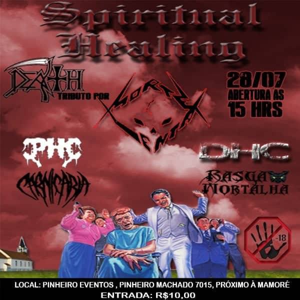 Com a chamada “Atenção Bangers Carniceiros!!!”, a organização do Tributo a banda “Death” de Death Metal com o nome “Spiritual Healing”, conclama quem curte o estilo de som para mais um evento, que teve mudança no seu local de realização. O show será no proximo sábado, dia 28, no Pinheiro Eventos, situado a Avenida Pinheiro Machado, 7015 próximo à Avenida Mamoré com entrada de R$ 10,00. A abertura dos portões será às 15 hs e proibido para menoes de 18 anos.