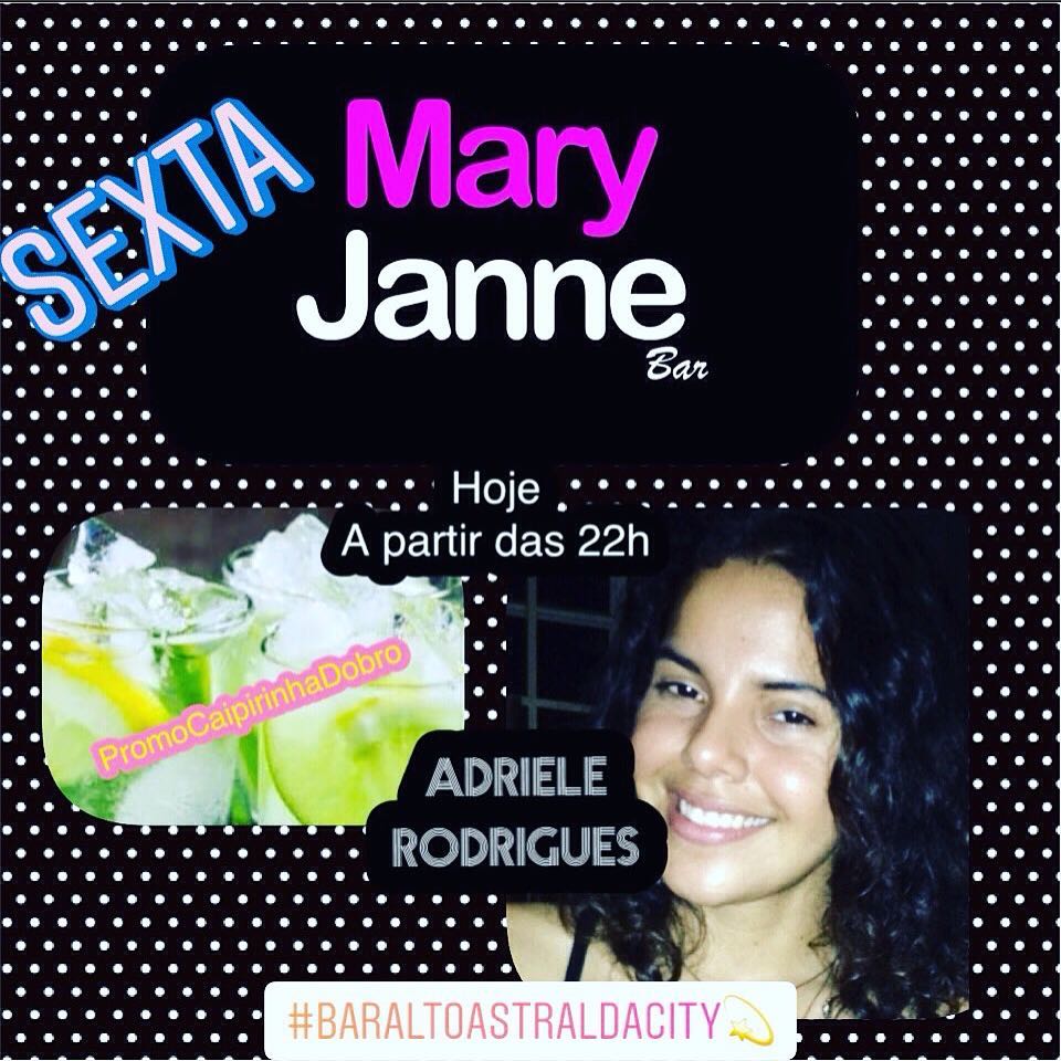 Sexta-feira, hoje a partir das 22 horas o Mary Jane Beer apresenta Adriele Rodrigues & Banda. A cantora vem com um time de feras: Erick Bennesby na Bateria, Maiela Johnson no Contra Baixo e participação especial de Thiago Marinho na Guitarra solo. O Mary Janne fica entre a Avanida Carlos Gomes com Rogério Weber, na esquina tendo como referência a Praça das Três Caixas Dágua e a Casa de Cultura Ivan Marrocos, bem na esquina.