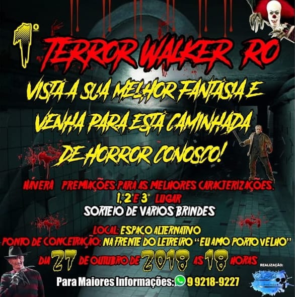 O mês do Halloween está chegando e você que gosta da comemoração pode participar do 1° Terror Walker, a caminhada de personagens de terror que será realizada dia 27 de outubro, no Espaço Alternaivo em frente ao letreiro "Eu amo Porto Velho", a partir das 18h00.