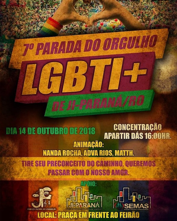 Ji-Paraná será palco da 7ª Parada do Orgulho LGBTI+, realizado pelo grupo LGBT do município. O evento se inicia neste sábado com a pré parada e segue para o segundo dia no domingo (14), às 16h00. O ponto de concentração será na praça em frente ao Feirão do Produtor. A animação do da festa é por conta da cantora Nanda Rocha, Adva Rios e Matth.