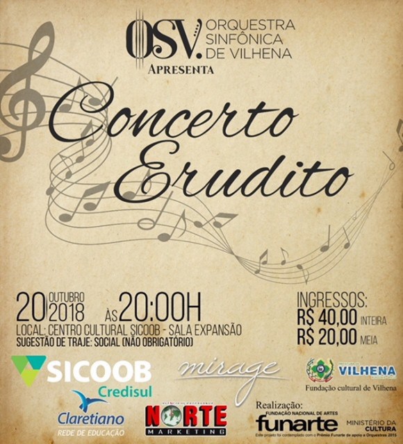 A Orquestra Sinfônica de Vilhena (OSV) apresentará neste sábado, 20/10, um concerto com o tema erudito. O evento será realizado na Sala Expansão, do Centro de Treinamento e Cultura Sicoob Credisul – CTC Sicoob Credisul, às 20h.
