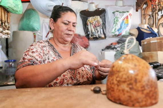 “Amo essa arte e não me vejo sem o artesanato - ele faz parte da minha vida. Produzo e vendo. Isso ganha um reforço, pois meu marido também é artesão e lá em casa temos um mundo encantado em nossas conversas criativas. Aqui, na Feira do Sol, o mais bonito é o companheirismo que a gente tem com os colegas artesãos. Nós somos uma família. Aqui uma mão lava a outra. A ajuda vai desde a venda das peças dos colegas até a ajuda na confecção de uma peça”, disse Maria de Nazaré Estevão, 57 anos e artesã desde os 13 anos.