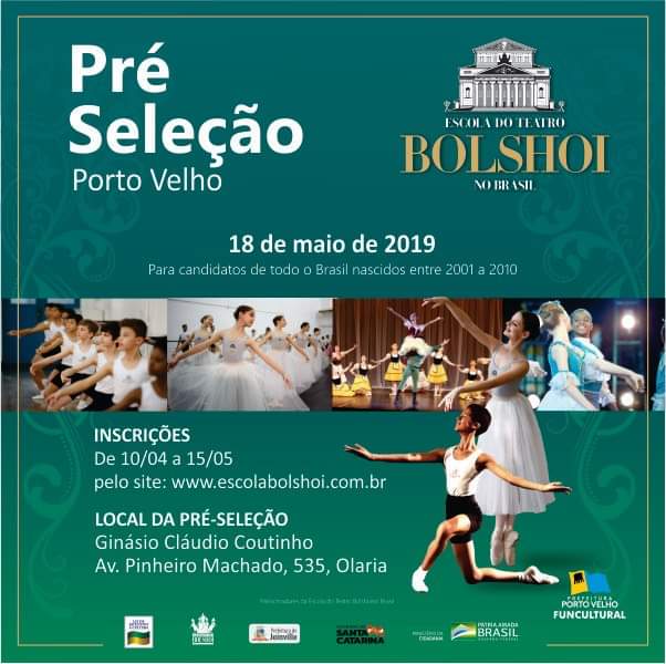 Começam, nesta sexta-feira (10/5), as inscrições para o processo seletivo de novos bailarinos da Escola do Teatro Bolshoi Brasil, que fará pré-seleção em Porto Velho no dia 18 de maio, no Ginásio Cláudio Coutinho. As inscrições devem ser feitas até o dia 15 de maio, às 23h59 (horário de Brasília), no site www.escolabolshoi.com.br, onde está disponível também o edital.