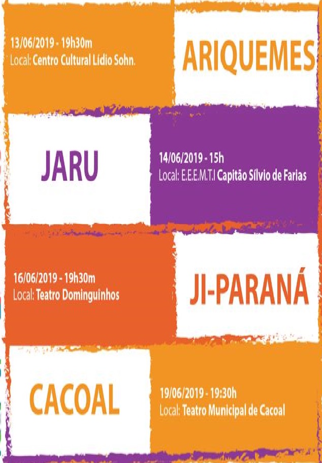 O primeiro município a receber a peça teatral é Ariquemes. Serão duas apresentações - nesta quarta,12, e quinta-feira,13, às 19h30, no Centro de Cultura Lídio Sohn. Na sexta,14 será a vez de Jaru - a apresentação ocorrerá na Escola Capitão Silvio de Farias, às 15 horas. No dia 16, domingo, o município de Ji-Paraná assistirá ao espetáculo, às 19h30, no Teatro Dominguinhos.
