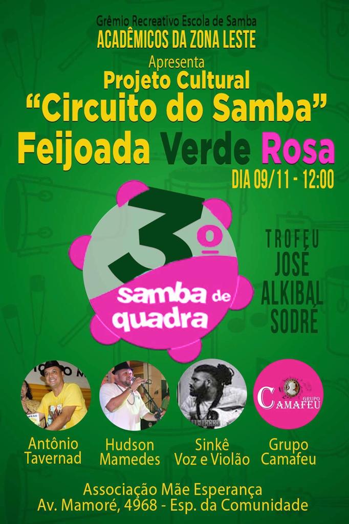 O G.R.E.S Acadêmicos da Zona Leste promove neste sábado,09, a partir das 12 horas, na Associação Mãe Esperança, o projeto Cultural “Circuito do Samba”. O evento contará com as participações de Sinkê Luiz Barbosa, Camafeu, Antônio Tavernard e Hudson Mamedes.