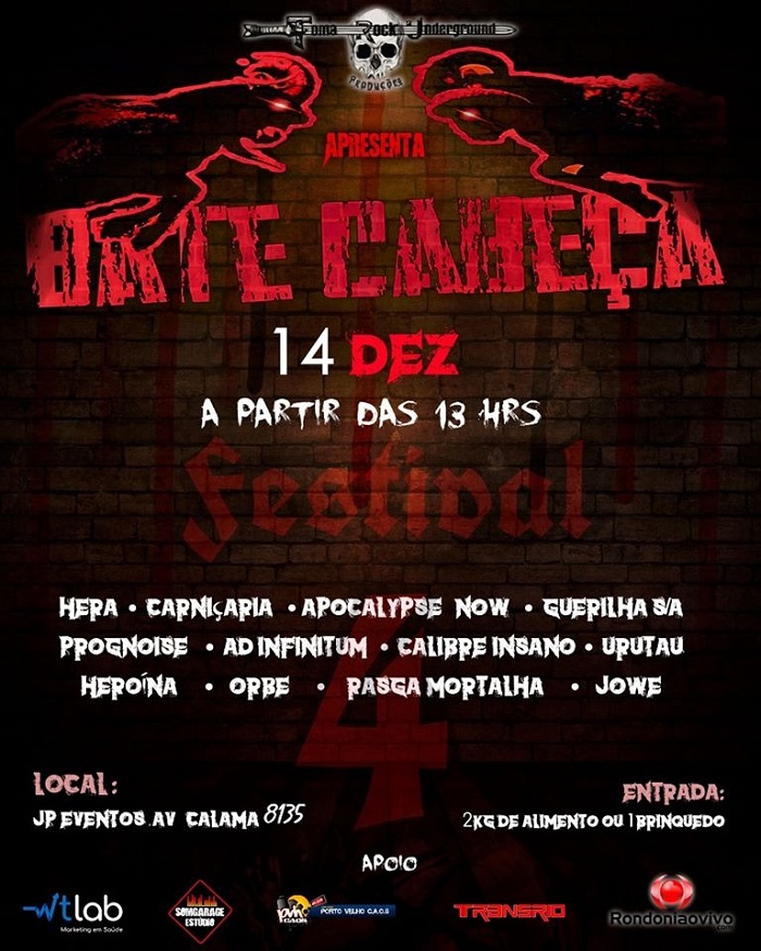 Agendado para o próximo dia 14 de dezembro a partir das 13h no Espaço JP Eventos, localizado no bairro Planalto em Porto Velho, a edição 2019 do Festival Bate Cabeça contará com as principais bandas do cenário underground da capital de Rondônia.