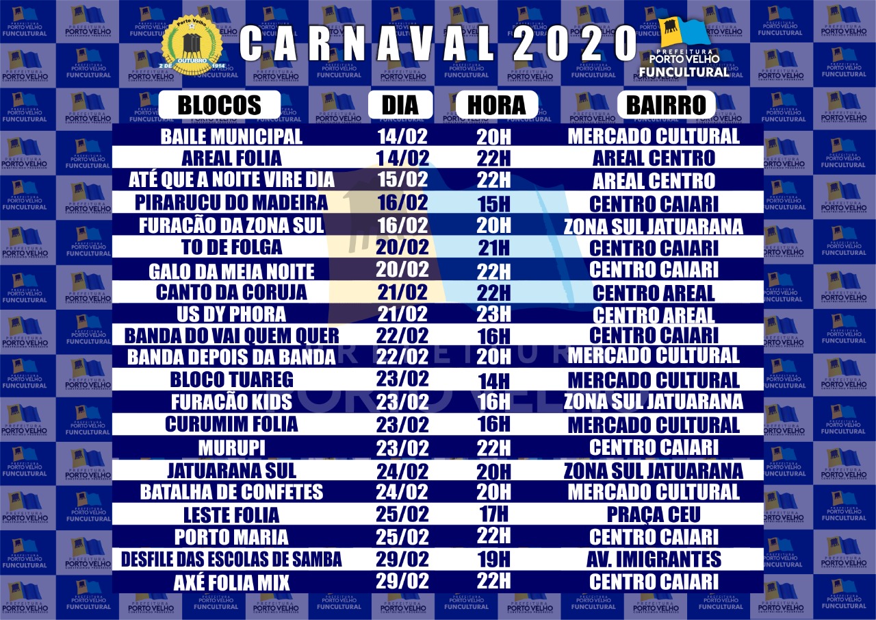 A prefeitura de Porto Velho, através da Fundação Cultural (FUNCULTURAL) preparou uma super programação de Carnaval que inclui atividades para crianças e adultos. As datas dos eventos oficiais começam nesta sexta-feira, dia 14, com o Baile Municipal, que será realizado no Mercado Cultural de Porto Velho, às 21 horas.