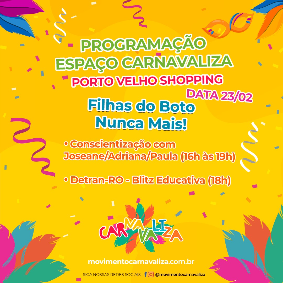 E no dia 23 de fevereiro, inicia as programações do Movimento Carnavaliza com a palestra da ONG 'Filhas do Boto Nunca mais' - Conscientização com Joseane/Adriana/Paula (16h às 19h) e Detran/RO - Blitz Educativa (18h).