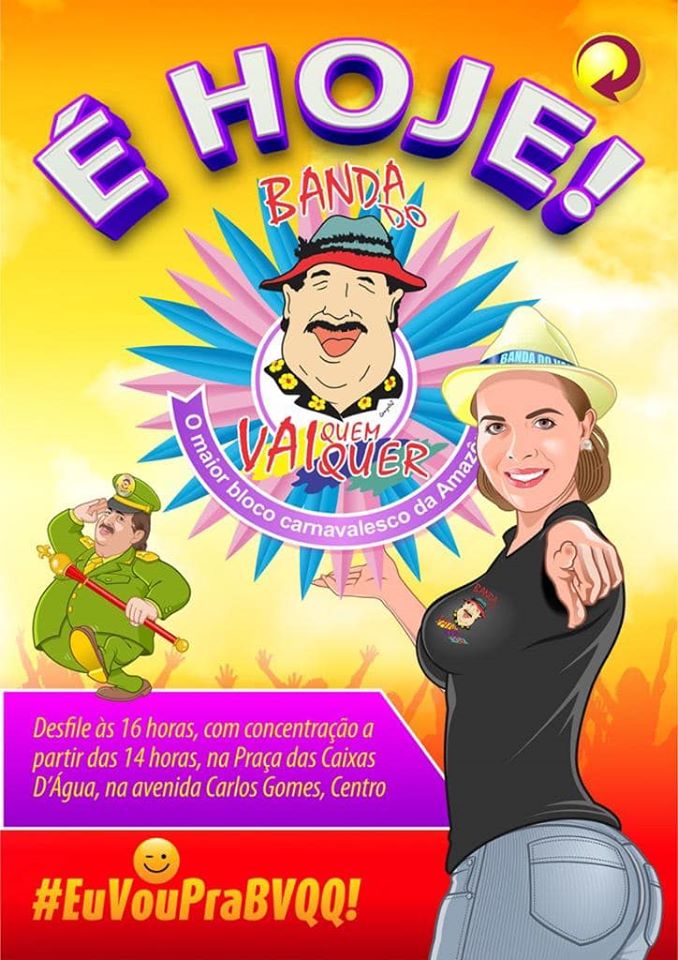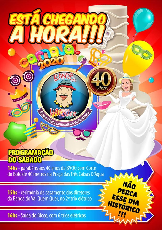 A presidente do maior bloco de carnaval de rua da Região Norte do país, Siça Andrade, confirma que já está tudo pronto para a Banda invadir as ruas e avenidas. Este ano, a Banda do Vai Quem Quer comemora seus 40 anos de folia, e para começar a comemoração da festa será servido um bolo de 400 quilos e 40 metros na Praça das Três Caixas D’Água, a partir das 14h.