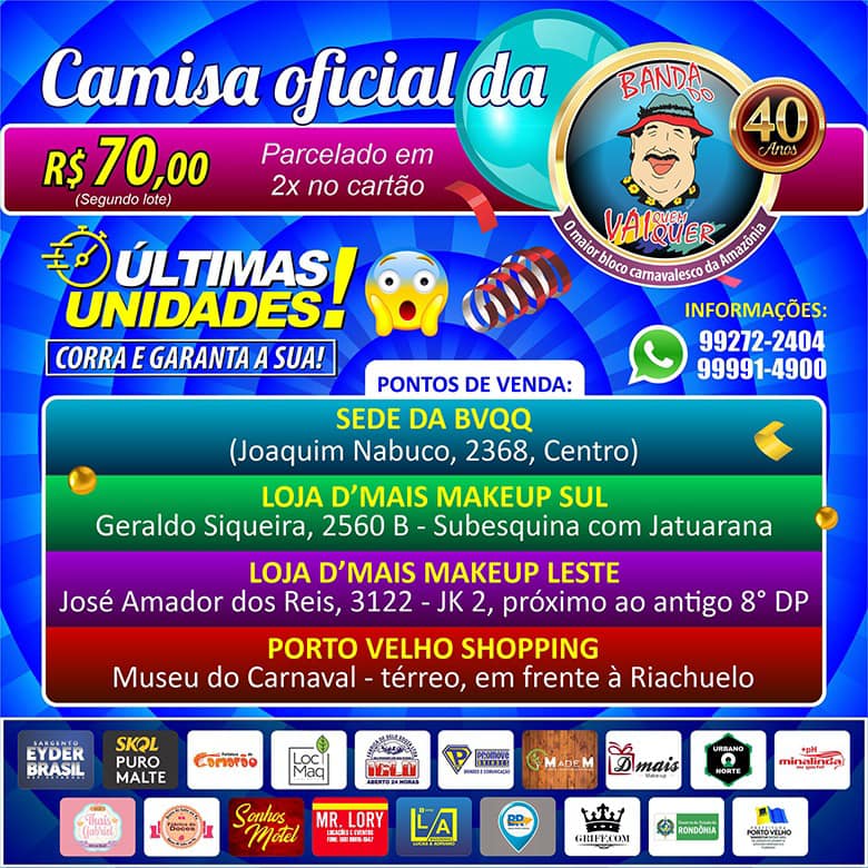 Restando poucas unidades de camisetas, o folião que ainda não adquiriu deve correr para garantir o seu lugar no cordão de isolamento. Serão mais de quatro horas de animação pelas principais vias do centro de Porto Velho.