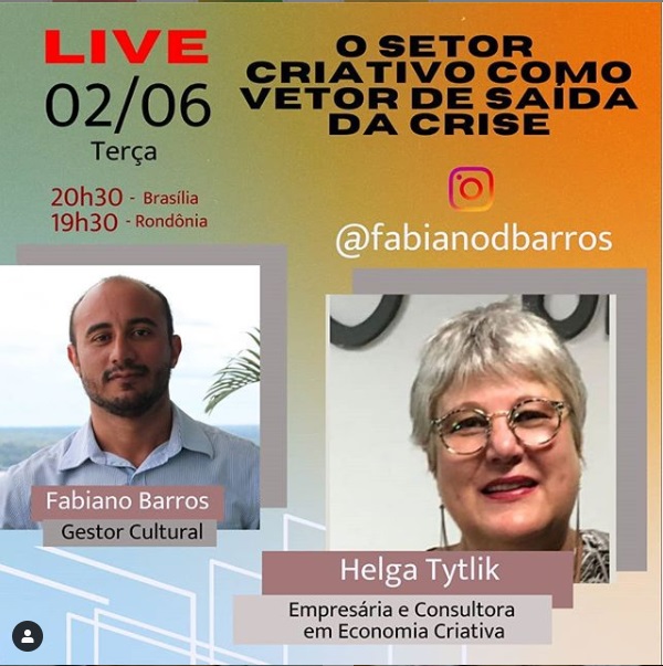 A economia criativa como alternativa para a crise na área da cultura é o tema da live que acontece nesta terça-feira, às 19h30 (horário local), com a palestrante Helga Tytlik, intermediado pelo produtor cultural de Rondônia, Fabiano Barros.