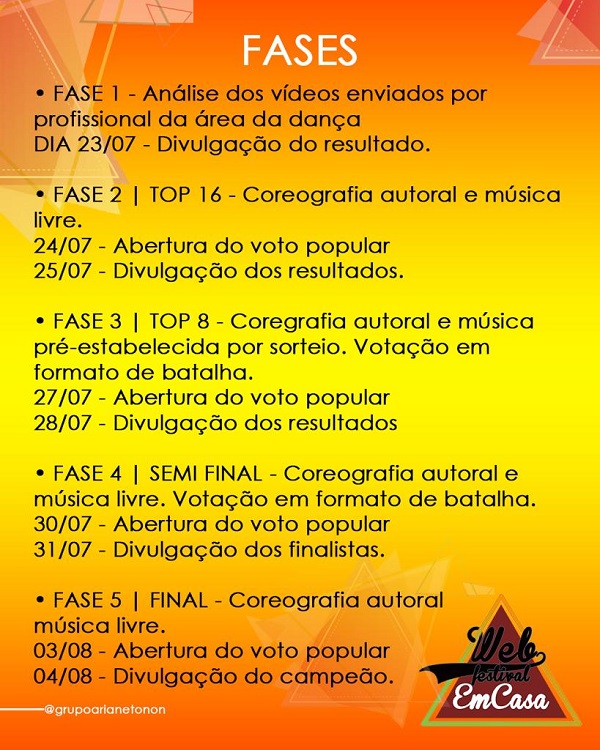 Estão abertas até o dia 20 deste mês as inscrições para o Web Festival em Casa, competição de dança online, no qual os participantes podem mostrar suas habilidades, coreografias e musicalidade.