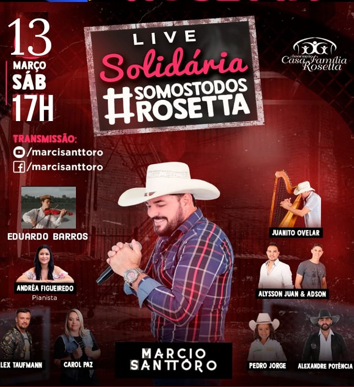 Nove cantores locais e regionais se apresentam neste sábado,13, a partir das 17 horas, na live solidária em prol da Casa Família RosettA. Será uma mistura do estilo clássico com o estilo sertanejo. O evento estava agendado para o último dia 6/3, mas devido a questões técnicas precisou ser adiado para hoje.