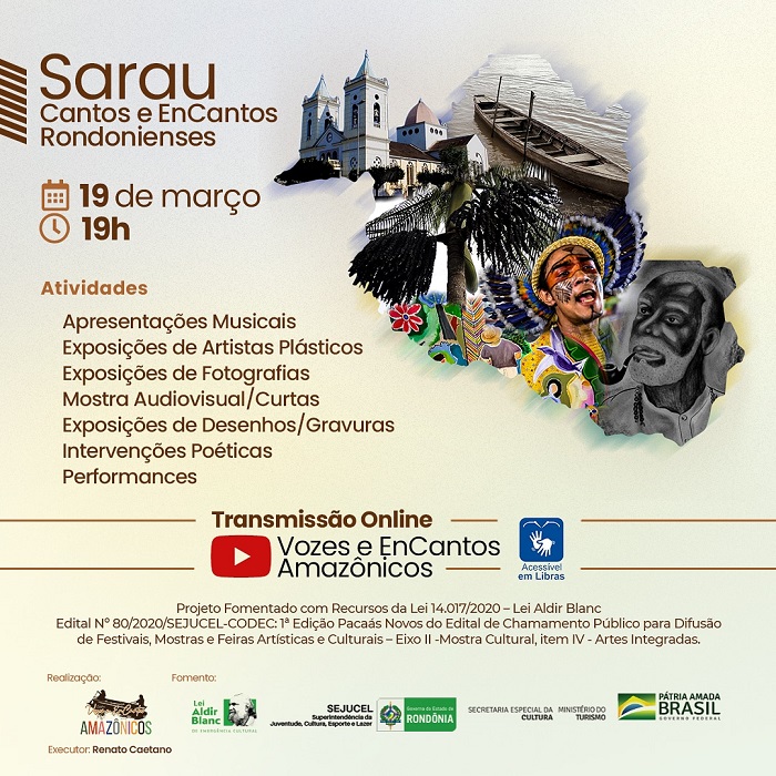 Será realizado nesta sexta-feira,19, com início às 19h, de forma online, o “Sarau Cantos e Encantos Rondonienses”. Pensado e planejado como uma mostra itinerante, o Sarau visa propiciar manifestações artísticas em linguagens e segmentos variados, como: artes visuais, audiovisual (curtas/documentários), música, poesia e intervenções performáticas.