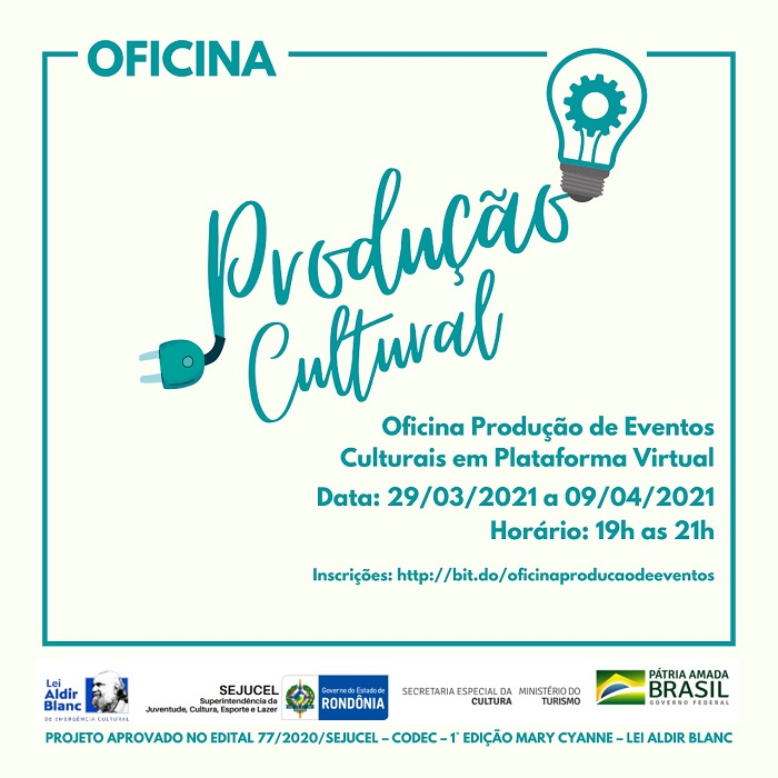 Dos dias 29 de março a 09 de abril ocorrerá a “Oficina Produção de eventos culturais em plataforma virtual”, projeto aprovado no Edital 77/2020/SEJUCEL – CODEC – 1° EDIÇÃO MARY CYANNE – Lei Aldir Blanc. A oficina tem por objetivo oferecer conteúdo gratuito para capacitação de artistas, produtores e público geral, que busca obter conhecimentos para utilização de ferramentas virtuais na realização de projetos culturais.