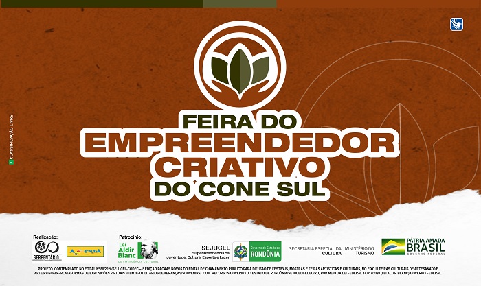 O projeto da Feira do Empreendedor Criativo do Cone Sul foi contemplado no edital Nº 80/2020/SEJUCEL-CODEC –1ª Edição Pacaás Novos do Edital de Chamamento Público para Difusão de Festivais, Mostras e Feiras Artísticas e Culturais, no Eixo III Feiras Culturais de Artesanato e Artes Visuais – Plataformas de Exposições Virtuais -Item IV- Utilitários/lembranças/souvenirs, com recursos Governo do Estado de Rondônia/SEJUCEL/FEDEC/RO, por meio da Lei Federal 14.017/2020 (Lei Aldir Blanc) Governo Federal.
