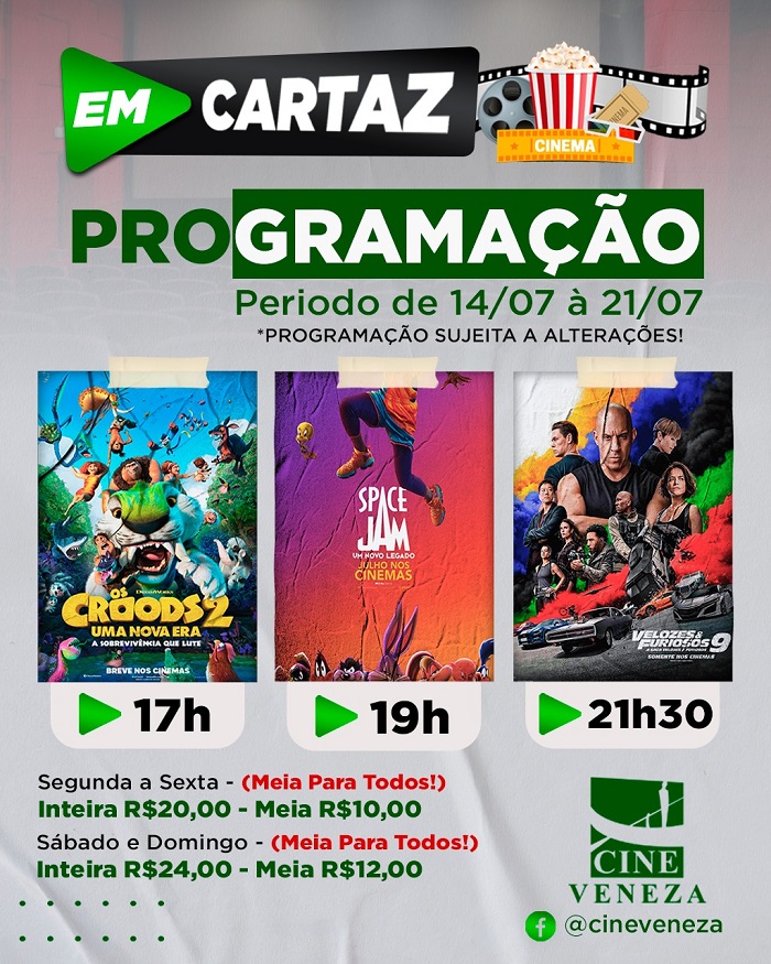 Está em cartaz também os filmes  "Velozes e Furiosos", às 21h30, e  "Os Croods2 - uma nova era", às 17 horas.