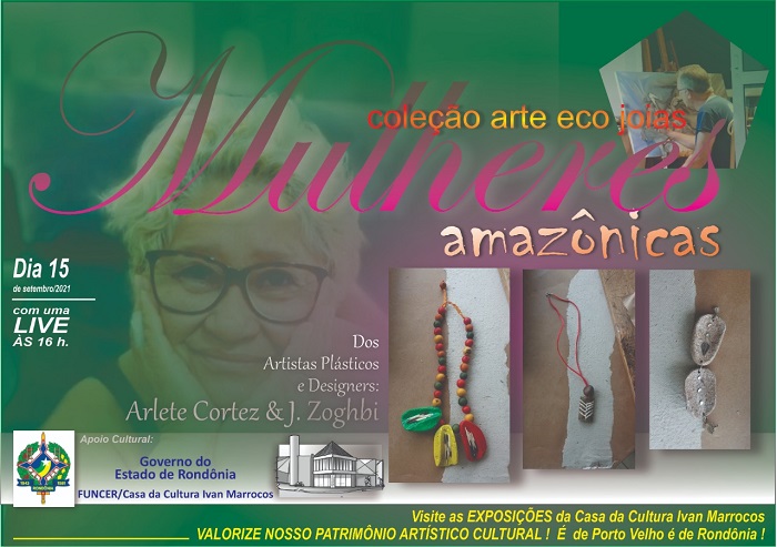 A ecologia será o mote da exposição “Arte Eco-Joias: Mulheres Amazônicas”, que será aberta nesta quarta-feira,15, às 16 horas, na Casa de Cultura Ivan Marrocos, em Porto Velho, Rondônia. Os expositores são os artistas plásticos e designers porto-velhenses Arlete Cortez e João Zoghby.