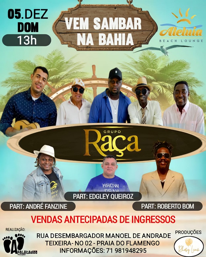 No domingo,5, ele se apresenta também no evento "Vem Sambar na Bahia", às 13 horas, no Aleluia Beach Lounge, que contará com a participação dos artistas André Fanzine, Roberto Bom e do grupo Raça.