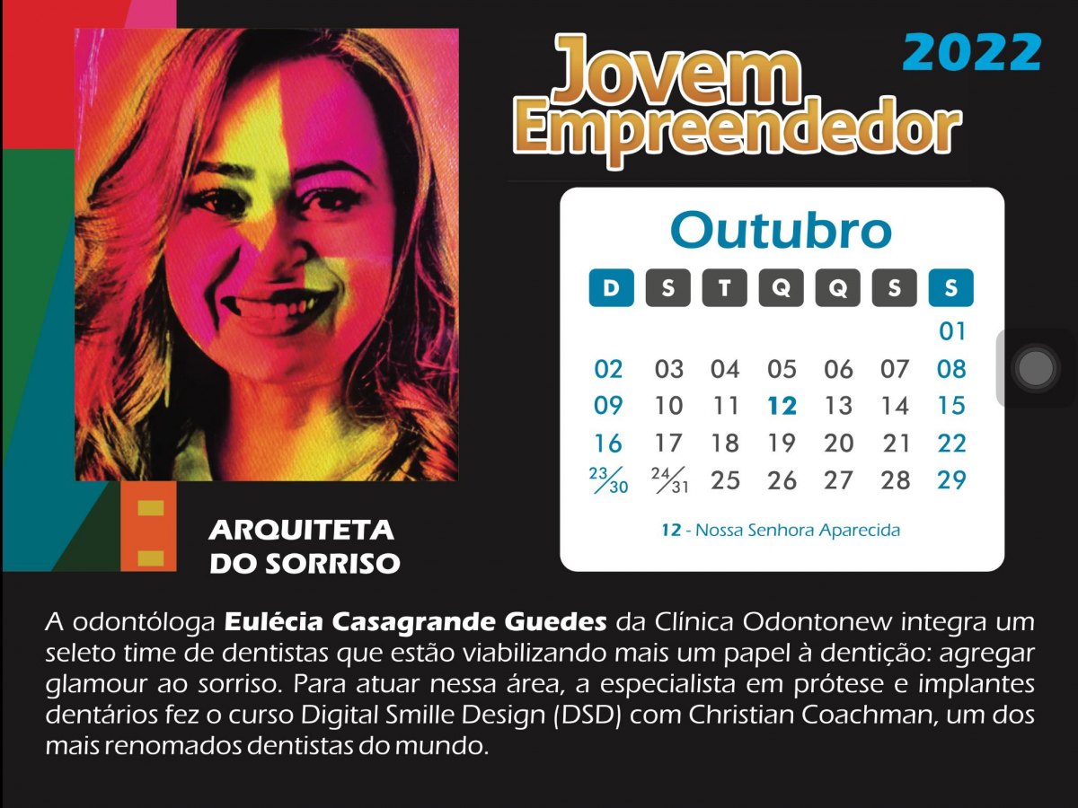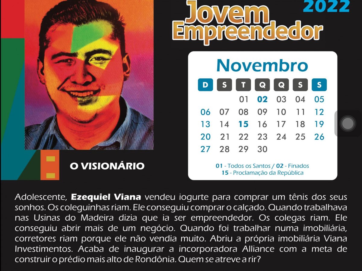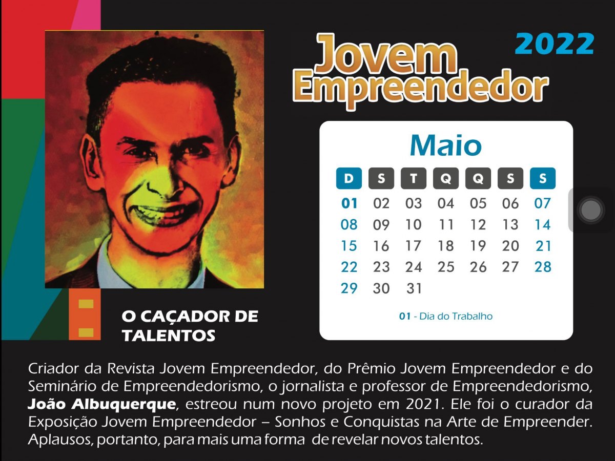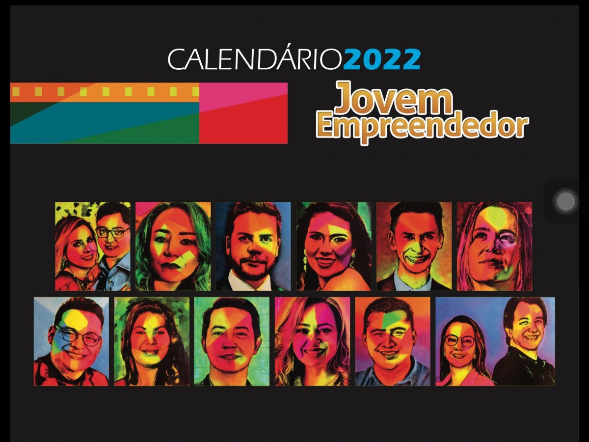 Homenageados - Estão no Calendário Jovem Empreendedor as seguintes obras de arte: Diagnóstico Humanizado ( Analú Barofaldi e Bruno Bernardes) ; A Embaixadora da Ortodontia (Juliana Volpato Curi Paccini); O Presidente ( Everton Melo da Rosa); A Diva Precoce ( Lucila Lacerda); O Caçador de Talentos ( João Albuquerque) A Executiva Premiada (Gabriela Zago ); O Jurista da Dignidade ( Raduan Moraes Brito) Visão de Futuro (Raísa Tavares); O Desbravador das Oportunidades ( André Carvalho); Arquiteta do Sorriso ( Eulécia Casagrande); O Visionário ( Ezequiel Viana) e Empreendedores da Inovação ( Fawez Holanda e Monna Razzak).