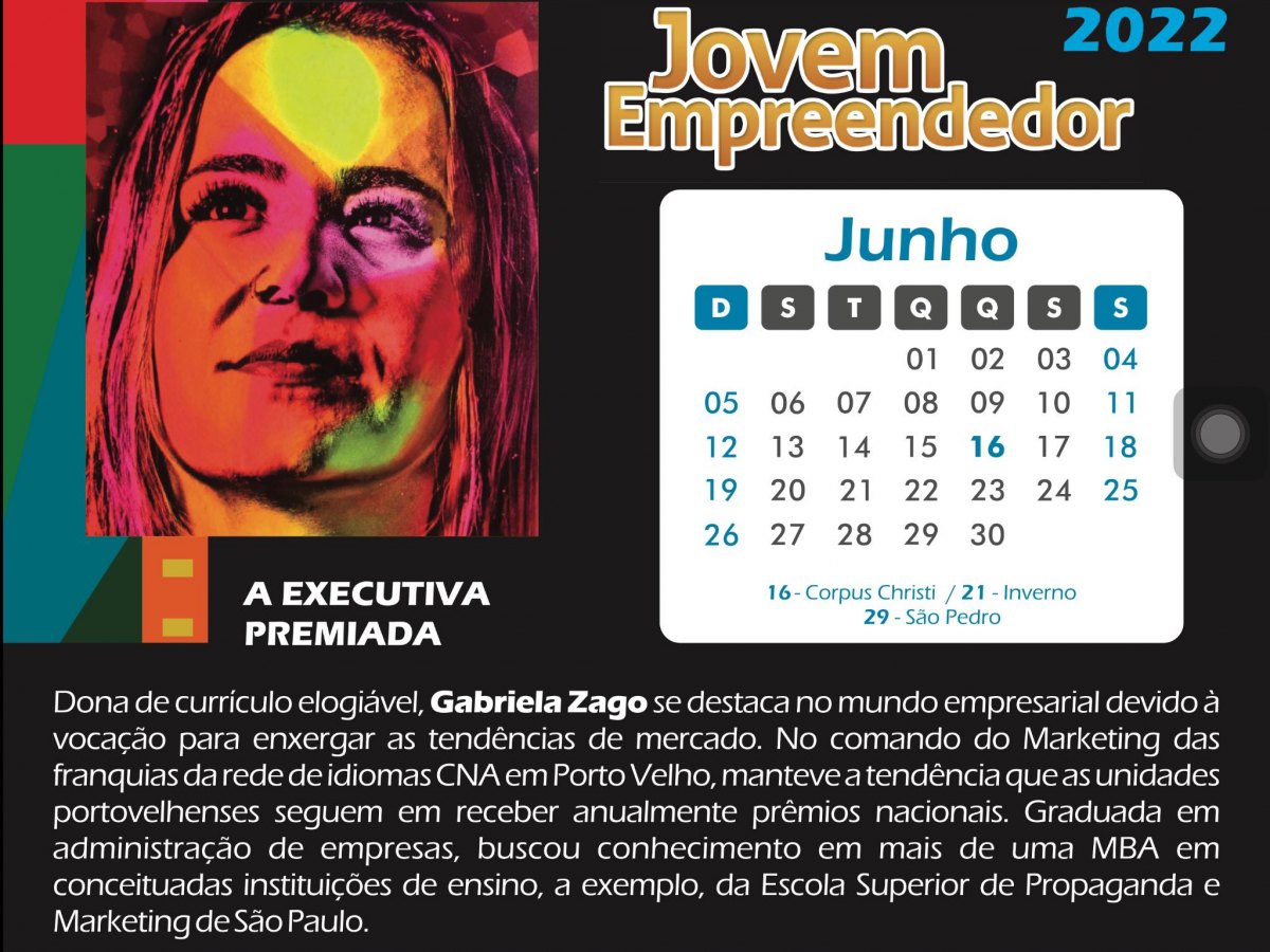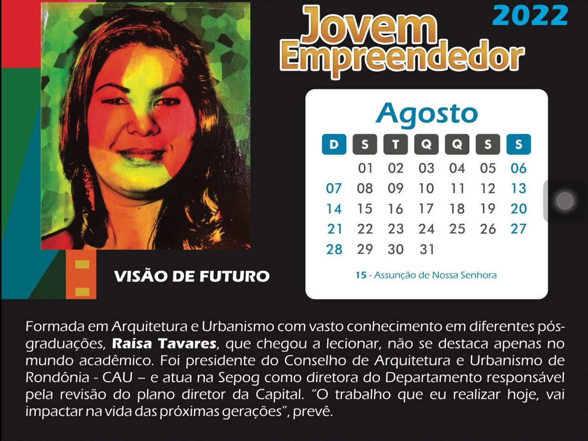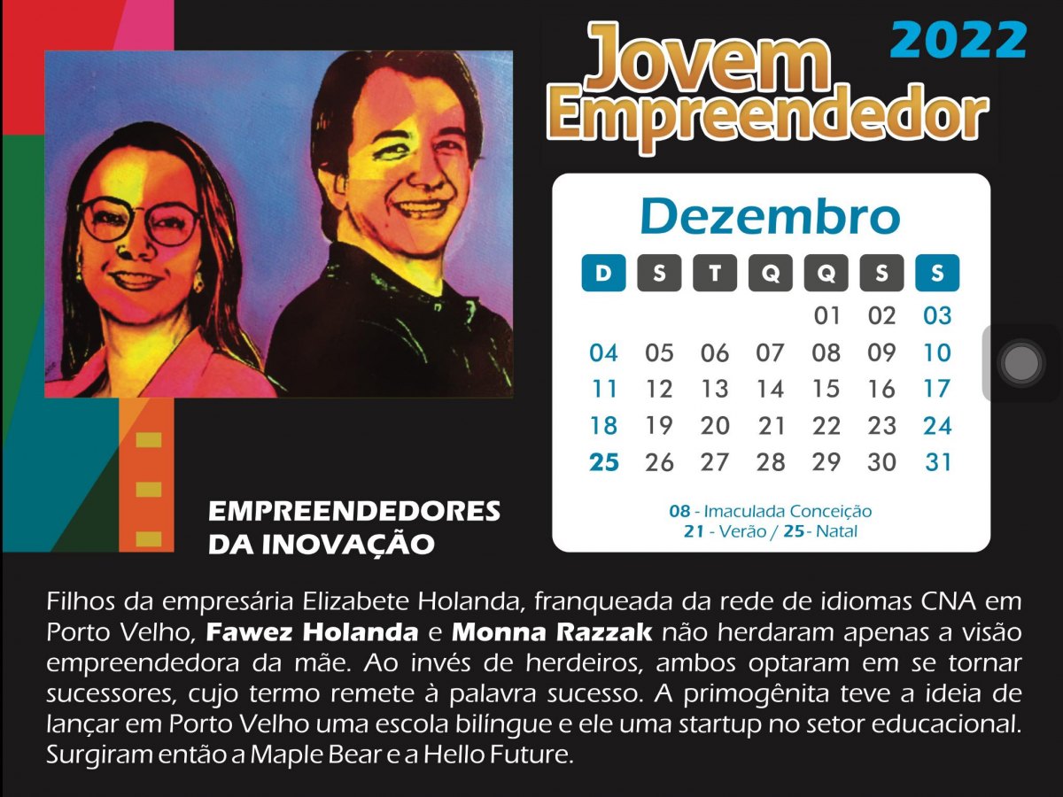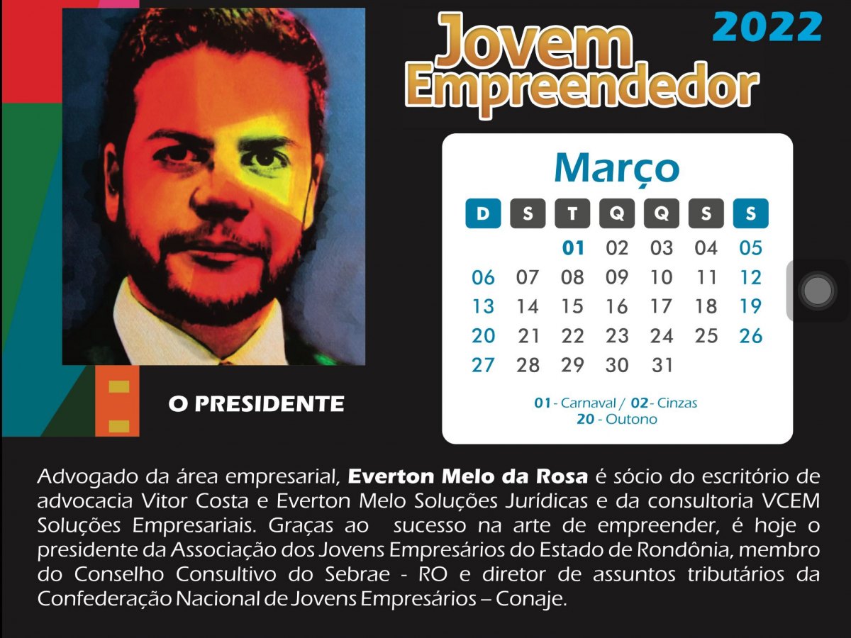 Homenageados - Estão no Calendário Jovem Empreendedor as seguintes obras de arte: Diagnóstico Humanizado ( Analú Barofaldi e Bruno Bernardes) ; A Embaixadora da Ortodontia (Juliana Volpato Curi Paccini); O Presidente ( Everton Melo da Rosa); A Diva Precoce ( Lucila Lacerda); O Caçador de Talentos ( João Albuquerque) A Executiva Premiada (Gabriela Zago ); O Jurista da Dignidade ( Raduan Moraes Brito) Visão de Futuro (Raísa Tavares); O Desbravador das Oportunidades ( André Carvalho); Arquiteta do Sorriso ( Eulécia Casagrande); O Visionário ( Ezequiel Viana) e Empreendedores da Inovação ( Fawez Holanda e Monna Razzak).