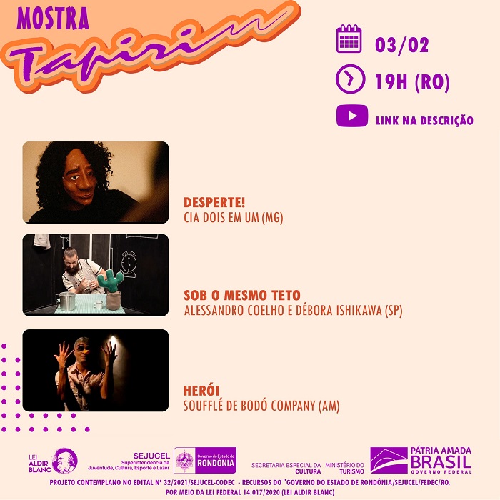 A programação da Mostra Tapiri- A Poética & A Cena iniciou nesta quarta,02, e se estende até o dia 05/02. A Mostra em sua segunda versão virtual, tem como foco a poética & a cena, com hibridismo entre linguagens artísticas, associando duas ou mais mídias. A transmissão será virtual.
