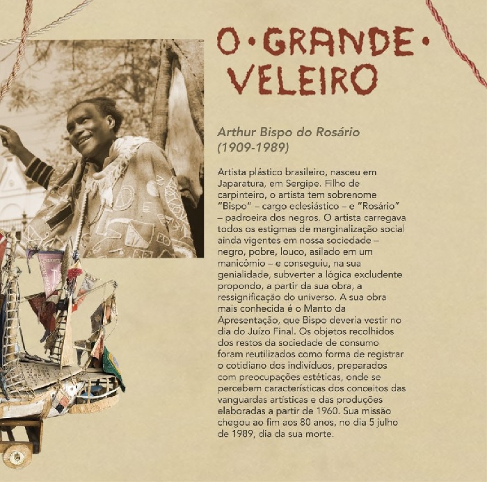 De acordo com a curadoria da exposição, através de estações sensoriais, o Grande Veleiro convida o público a interagir com os diversos elementos que constituem a vida e a obra poética de Arthur Bispo do Rosário (1909 –1989). A abertura acontecerá no dia 08 de março (sexta-feira), às 19h, na Galeria Forte Príncipe da Beira – Casa de Cultura Ivan Marrocos, localizado na Av. Carlos Gomes, 563 – Caiari.