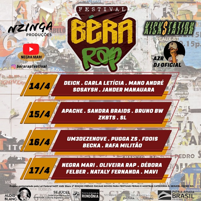 O primeiro Béra Rap Festival de Hip Hop de Rondônia inicia nesta sexta-feira,14, e se estende até o dia 17 deste mês, no formato virtual. Serão cinco atrações diárias com a participação de 42 artistas de três estados – Rondônia, Mato Grosso (Cuiabá) e Amazonas (Manaus). O evento será transmitido pelo canal do Youtube/Negra Mari.