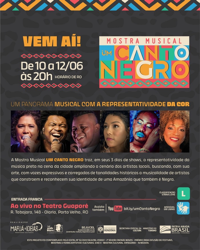 Acontece neste final de semana em Porto Velho a primeira edição da Mostra Um Canto Negro, uma iniciativa que visa dar espaço a cantores negros da capital. O evento, que acontece de maneira híbrida, abre as portas do Teatro Guaporé ao público, dias 10, 11 e 12 de junho, às 20h, ao mesmo tempo que é transmitido, ao vivo, pelas redes sociais.