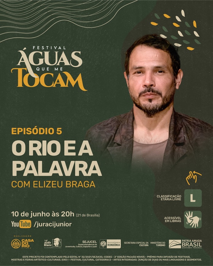 O Rio e a Palavra. No quinto e último episódio do Festival Águas que me Tocam, que vai ao ar nesta sexta-feira (10), a íntima relação do poeta e multiartista Elizeu Braga com o movimento das águas barrentas do Rio Madeira dá o tom ao bate-papo sobre a literatura e o poder das palavras no processo de afirmação da identidade beradeira amazônida. O episódio vai ao ar a partir das 20h do horário de Rondônia, pelo YouTube: https://www.youtube.com/juracijunior.