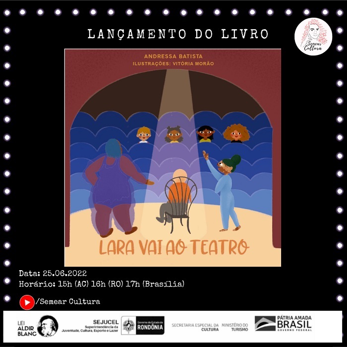 Neste sábado, 25, às 16h, ocorrerá a Live de lançamento do livro infantil “Lara vai ao teatro”, no Youtube da Semear Cultura, por meio do link: https://youtu.be/40472dsVcag