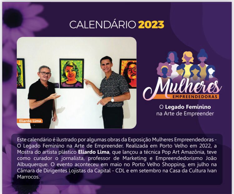 Trata- se do Calendário Mulheres Empreendedoras, que será ilustrado por doze das dezenove obras de arte da mostra do artista plástico Eliardo Lima que aconteceu em três pontos estratégicos de Porto Velho.