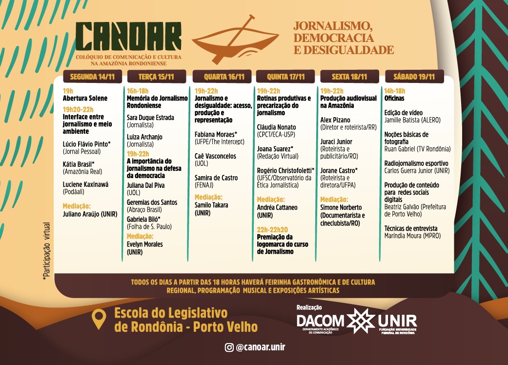 O CANOAR é um evento organizado pelo Departamento Acadêmico de Comunicação (DACOM) da Universidade Federal de Rondônia (UNIR), que abriga o curso de Jornalismo. O curso foi fundado em 2002 em Vilhena e há dois anos passou a funcionar em Porto Velho. Esta será uma oportunidade de apresentar de que forma o curso de Jornalismo da UNIR pode contribuir socialmente para a capital, formando profissionais conhecedores de diferentes realidades, pois o evento contará com convidados de todas as cinco regiões do Brasil.