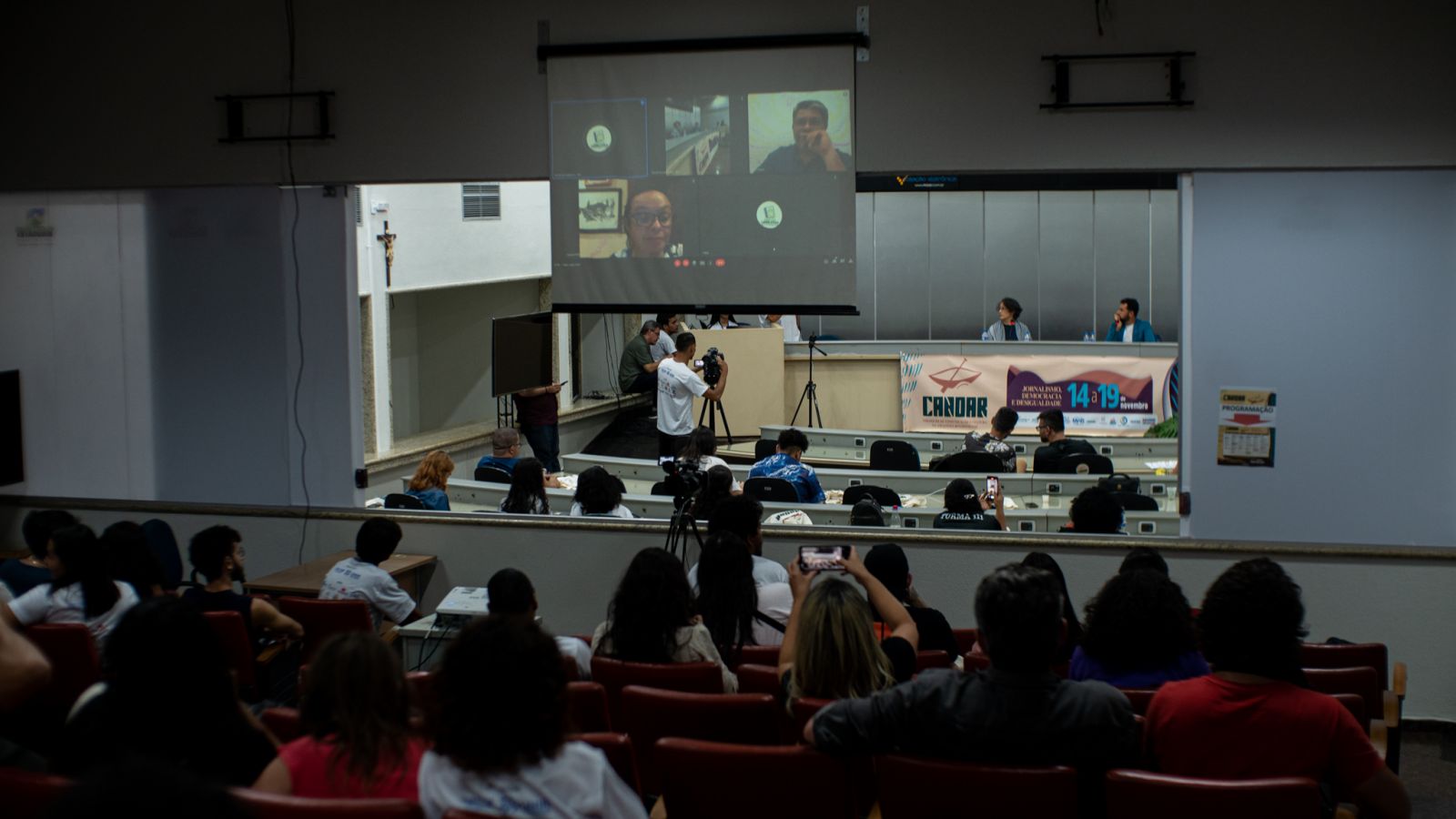 Na última sexta (18), finalizando a programação de palestras do CANOAR – I Colóquio de Comunicação e Cultura na Amazônia Rondoniense –, o auditório da Escola do Legislativo sediou uma mesa de debate sobre produção audiovisual amazônica. Participaram da conversa Jorane Castro, produtora, roteirista, diretora e professora do curso de Cinema e Audiovisual da Universidade Federal do Pará; Juraci Júnior, diretor, ator, apresentador, especialista em Direção de Criação de Conteúdo; e Alex Pizano, diretor e produtor. A discussão foi mediada pela jornalista, assessora e produtora audiovisual Simone Norberto.