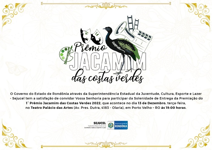 Com a finalidade de condecorar os Artistas dos diferentes segmentos culturais do Estado, assim como as Manifestações Tradicionais reconhecidas pelo Estado como Patrimônio Histórico-Cultural Imaterial, além de registrar homenagens aos baluartes da cultura, acontece nesta terça-feira (13), no Teatro Palácio das Artes em Porto Velho, às 19h, a primeira edição do Prêmio “Jacamin das Costas Verdes”.