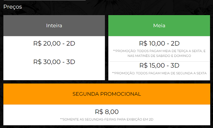 No horário em que será exibido em 2D, o valor é R$ 15 (inteira) e R$ 10,00 (meia); já em 3D, a entrada passa para R$ 30,00 e R$ 20,00, respectivamente.