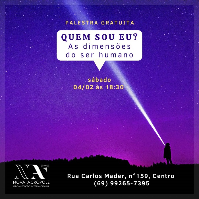 A Nova Acrópole Porto Velho realiza a palestra "Quem sou eu? As dimensões do Ser Humano", neste sábado (4), às 18h30. "Na vida, o ser humano tem muitas funções, desejos e ideias. Será que somos algumas dessas coisas ou a soma de tudo. Ou ainda, será que somos muito além", afirma o palestrante Fabrício Neves, diretor da instituição.
