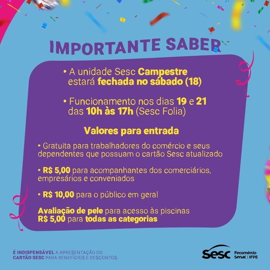 O Sistema Fecomércio/Sesc/Senac/IFPE, por meio do Sesc Rondônia, anuncia a retomada do Sesc Folia – projeto que leva programação cultural e recreativa para toda população, sobretudo aos trabalhadores do comércio, durante o período de carnaval. Nos dias 19 e 21 de fevereiro os foliões poderão desfrutar de uma programação diversificada nas dependências do Sesc Campestre, em Porto Velho, além de terem acesso às piscinas e demais estruturas de lazer da unidade.